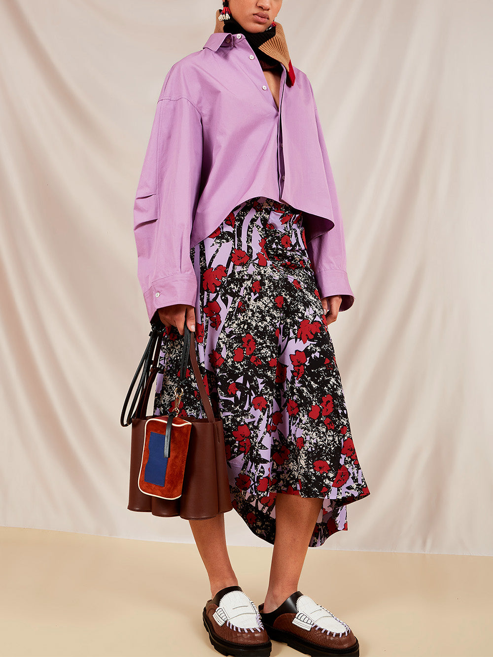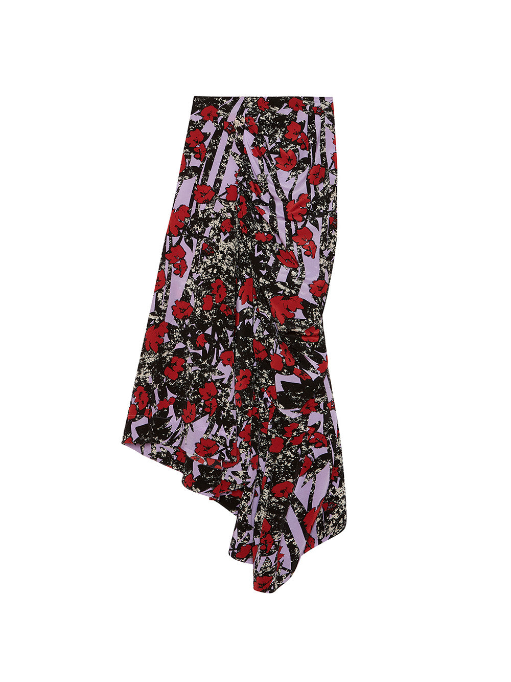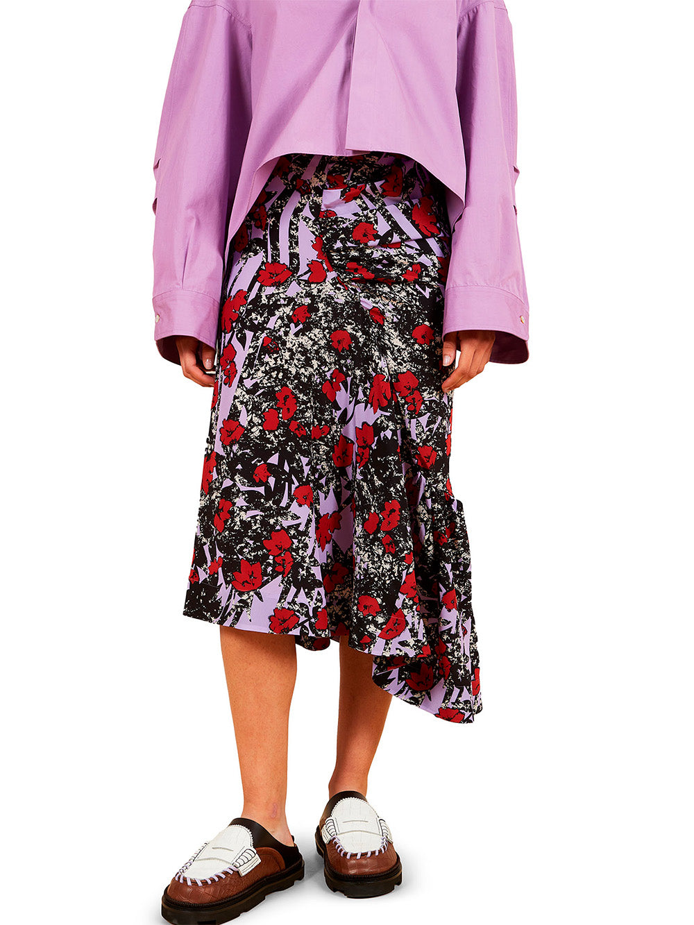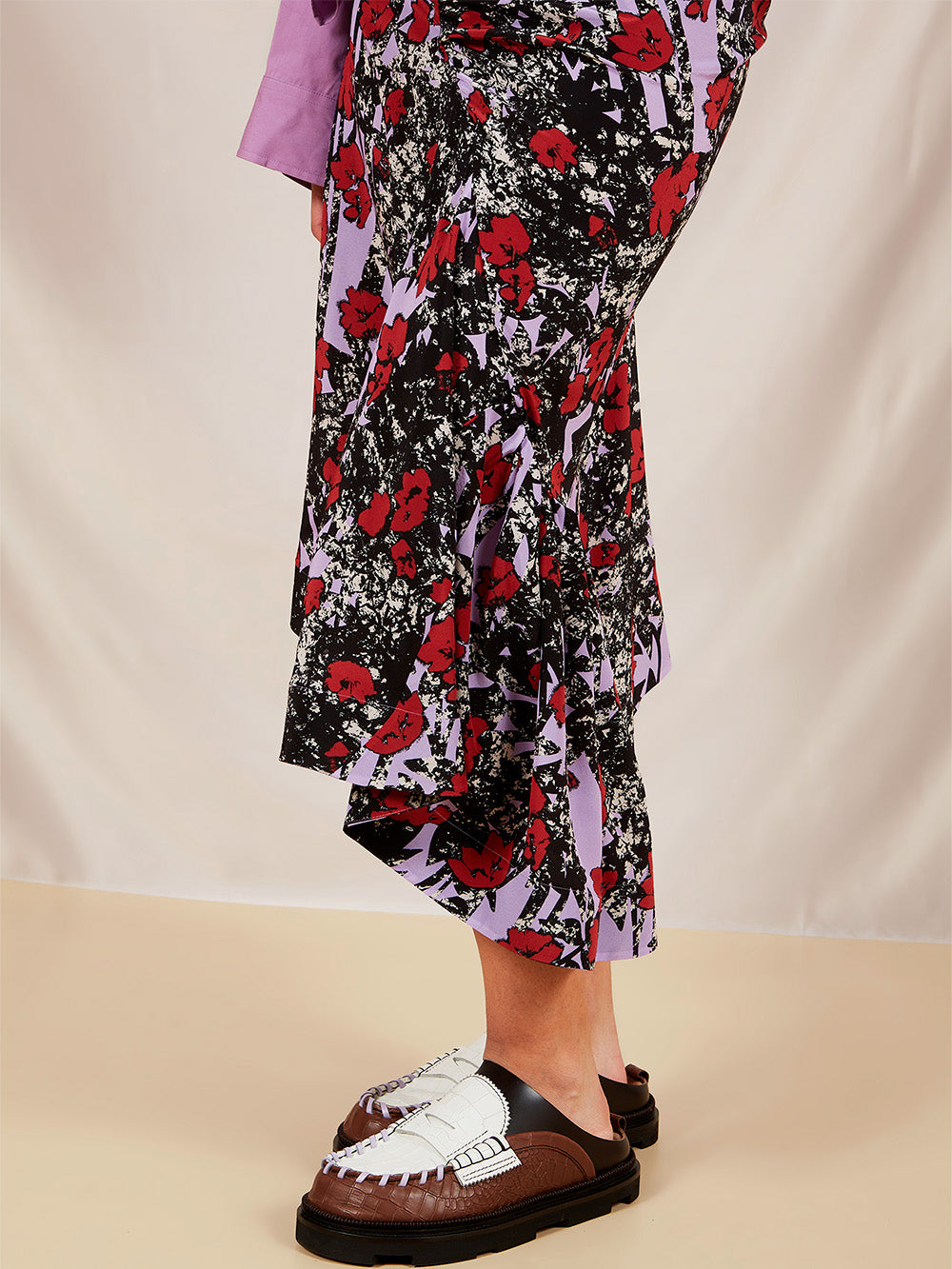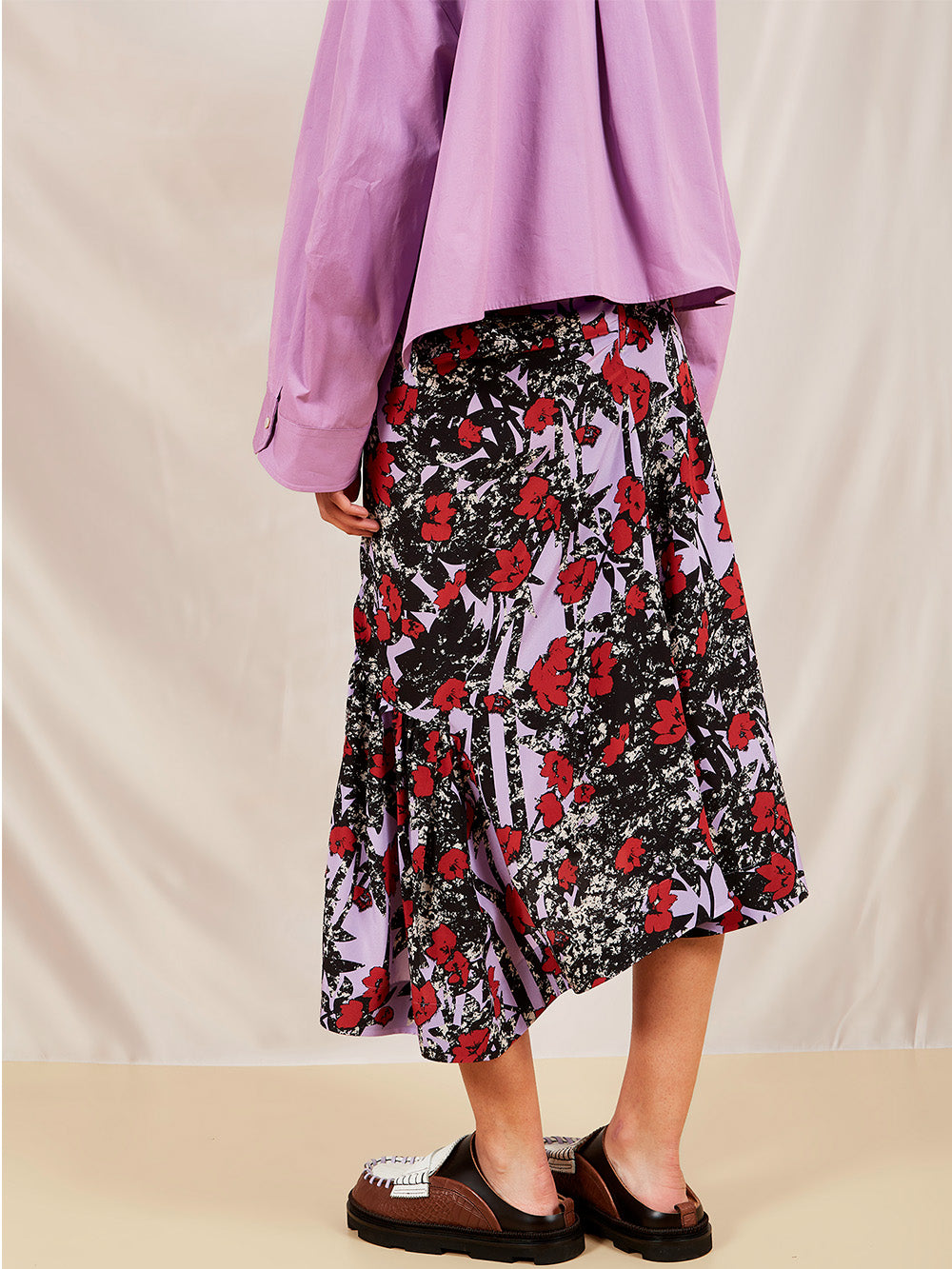 Jupe Dallas signée Colville confectionné en un tissu imprimé de fleurs rouge sur fond violet. Une jupe asymétrique accompagné d'un volant sur toute la longueur donnant un effet de drapé.