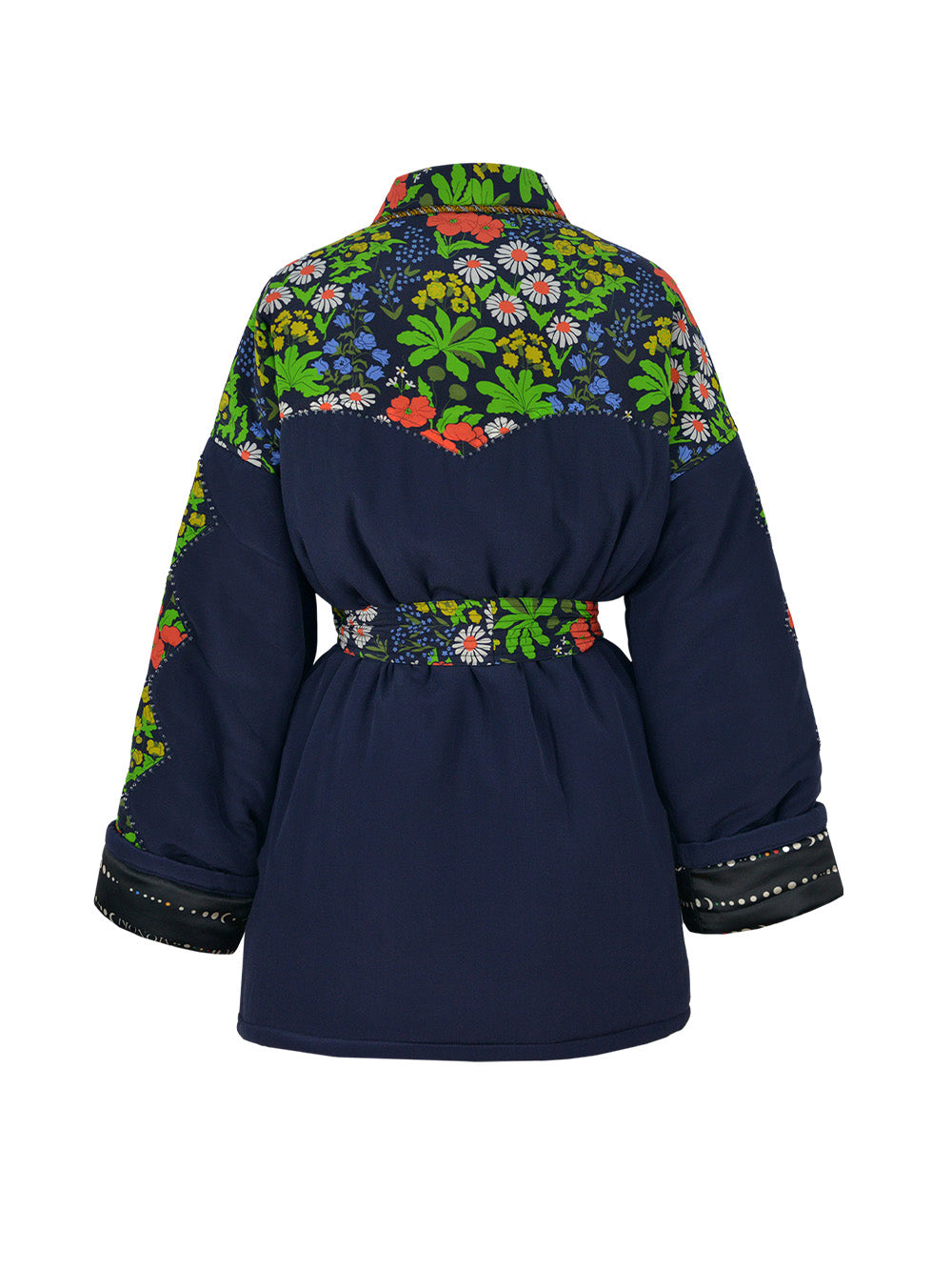 Kimono Fever signé Monoki confectionné en soie de couleur bleu marine accompagné de pans en patchworks fleuris créant un contrast lumineux. Un kimono se fermant à la taille par une ceinture assortie et à la doublure satinée imprimé de motifs stellaires.