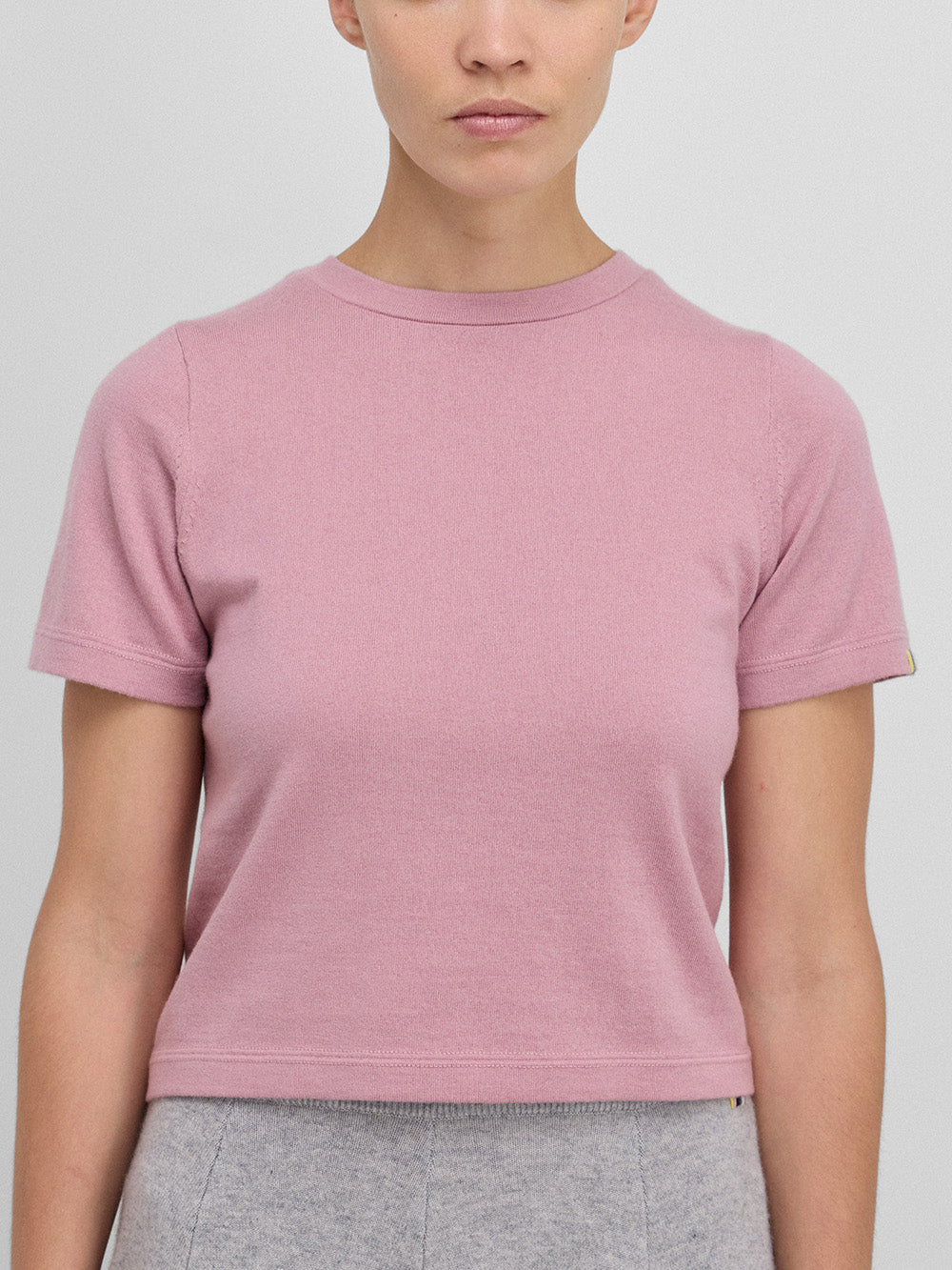 N°267 Top Tina signé Extreme Cashmere confectionné dans un mélange de cachemire et de coton de couleur rose. Une coupe courte droite, à manches courtes.