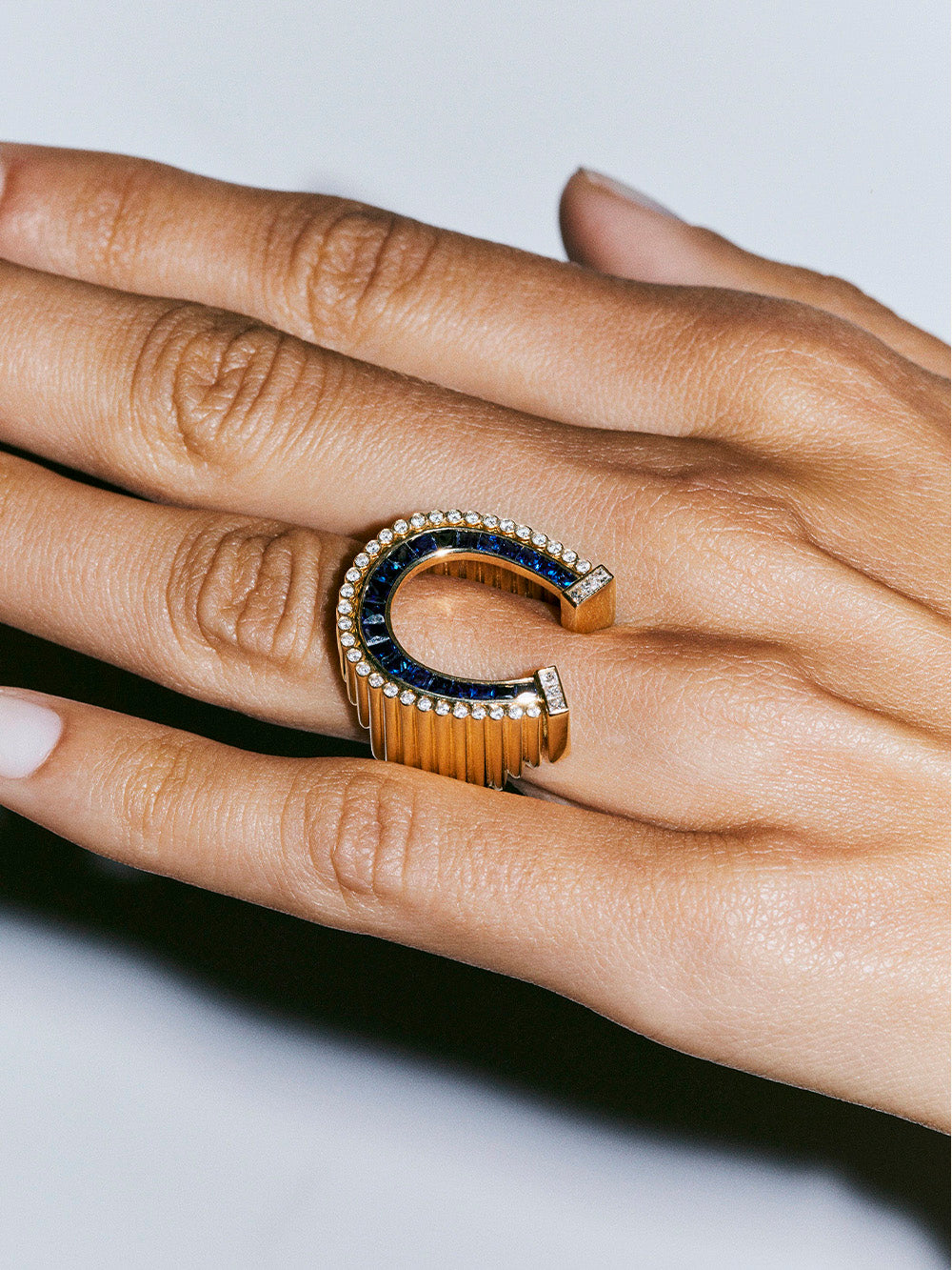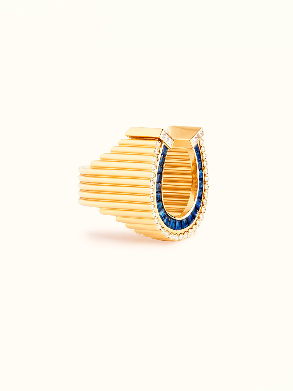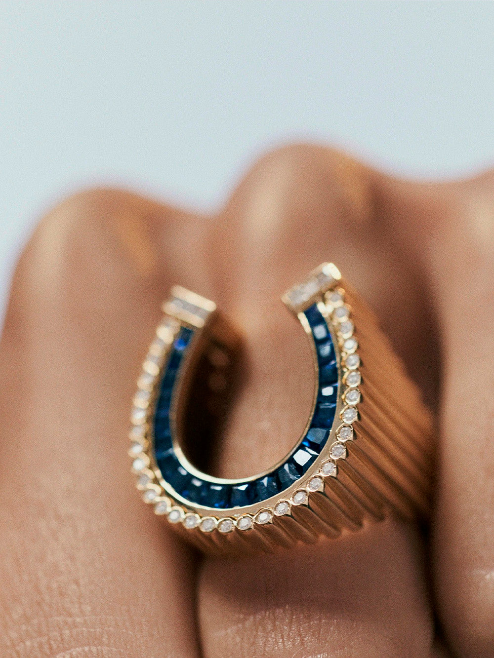 Cette bague Horse Shoe en or jaune 18 carats de la créatrice Marie Lichtenberg est un bijou godronné, serti de diamants blancs et de saphirs bleus en forme de fer à cheval. Cette pièce est entièrement réalisée à la main dans les ateliers italiens de la marque.