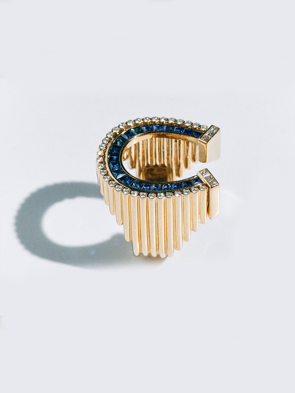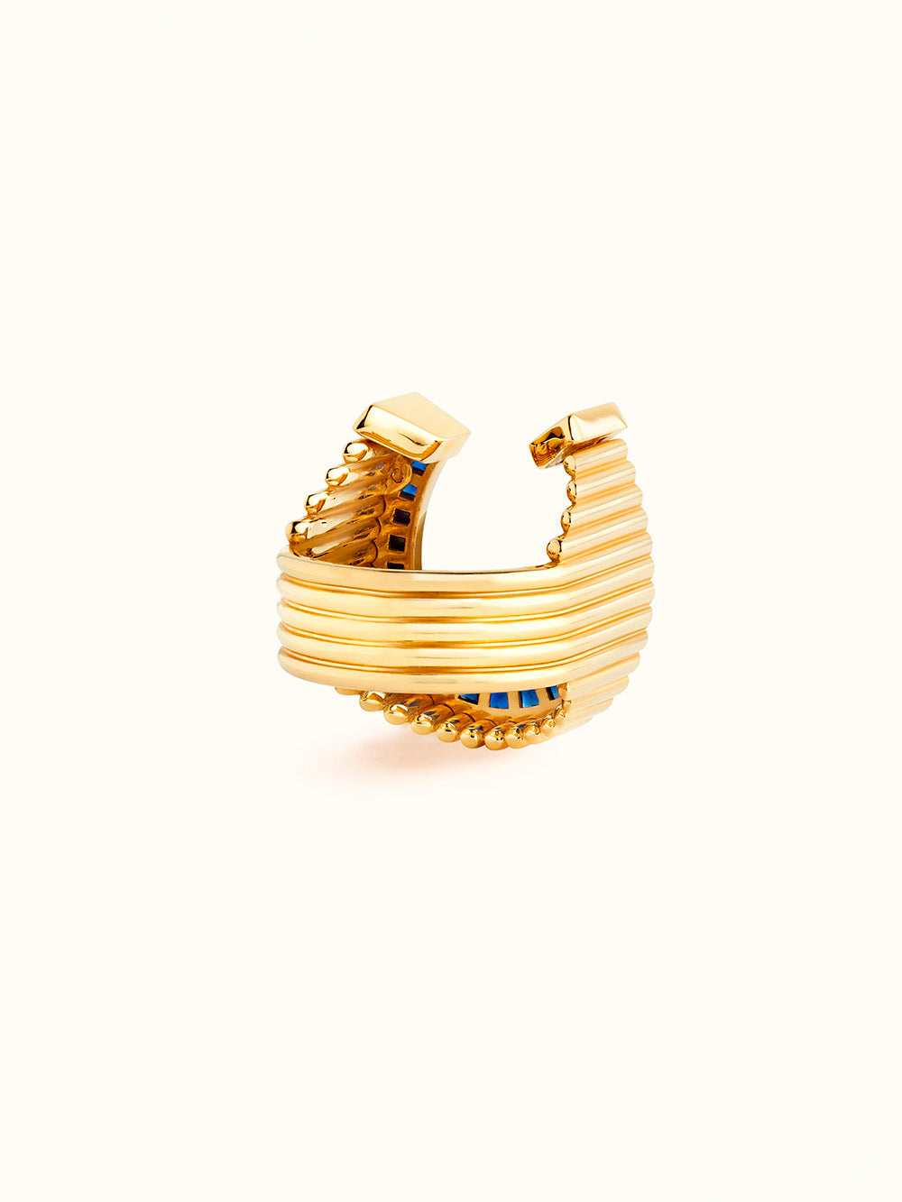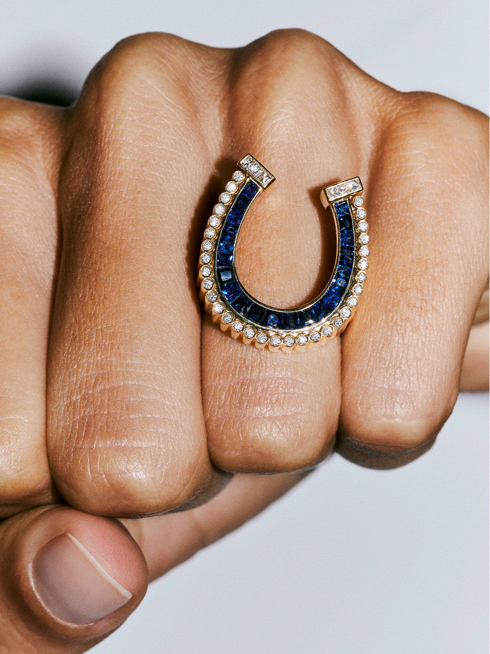 Cette bague Horse Shoe en or jaune 18 carats de la créatrice Marie Lichtenberg est un bijou godronné, serti de diamants blancs et de saphirs bleus en forme de fer à cheval. Cette pièce est entièrement réalisée à la main dans les ateliers italiens de la marque.