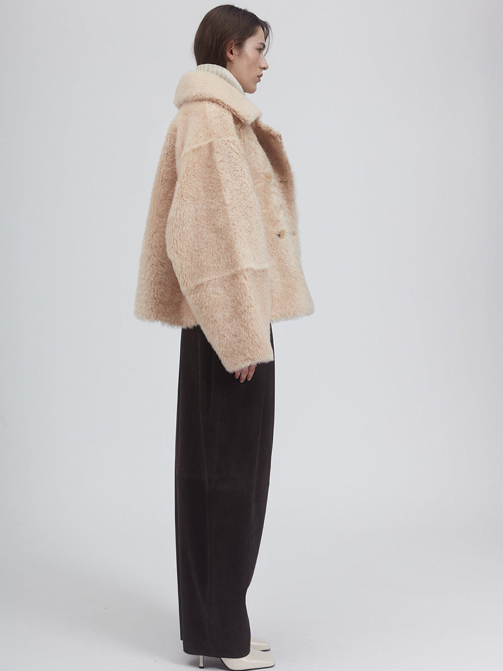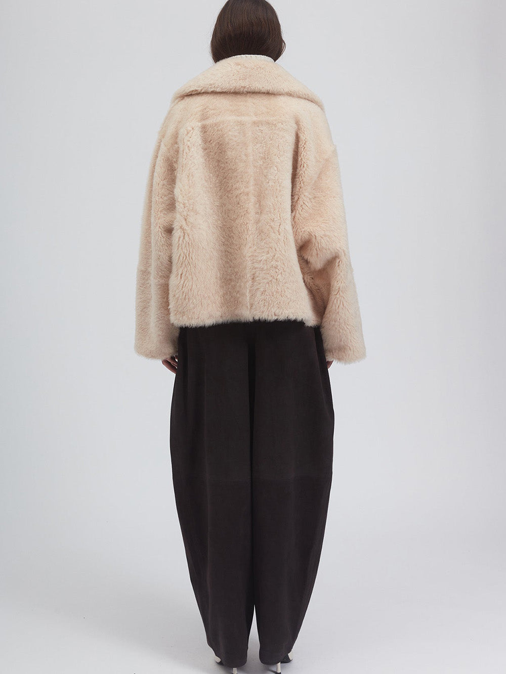 Veste Jeir Lacon Teddy signée Utzon confectionnée dans une fourrure véritable de couleur beige. Un caban court réversible aux manches oversized.